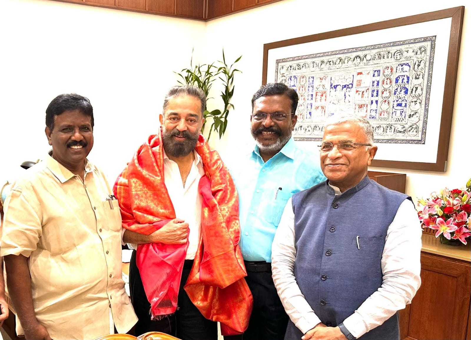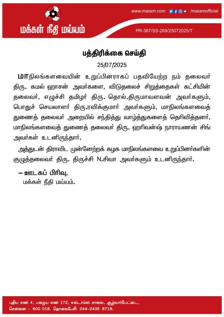 மாநிலங்களவையின் உறுப்பினராகப் பதவியேற்ற நம் தலைவர் திரு. கமல் ஹாசன் அவர்களை, விடுதலைச் சிறுத்தைகள் கட்சியின் தலைவர், எழுச்சி தமிழர் திரு. தொல்.திருமாவளவன் அவர்களும், பொதுச் செயலாளர் திரு.ரவிக்குமார் அவர்களும், மாநிலங்களவைத் துணைத் தலைவர் அறையில் சந்தித்து வாழ்த்துகளைத் தெரிவித்தனர். மாநிலங்களவைத் துணைத் தலைவர் திரு. ஹரிவன்ஷ் நாராயணன் சிங் அவர்கள் உடனிருந்தார்.