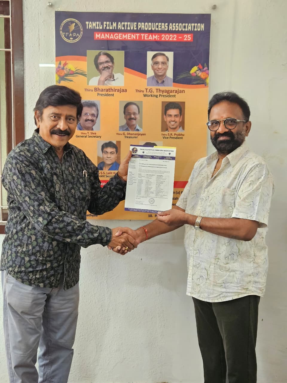 Thiru R.V. Uthayakumar, Election Officer, handed over the official election announcement letter to this effect to the General Secretary Mr. T. Siva at TFAPA office today and wished the new Management Team a greater success in the years ahead.