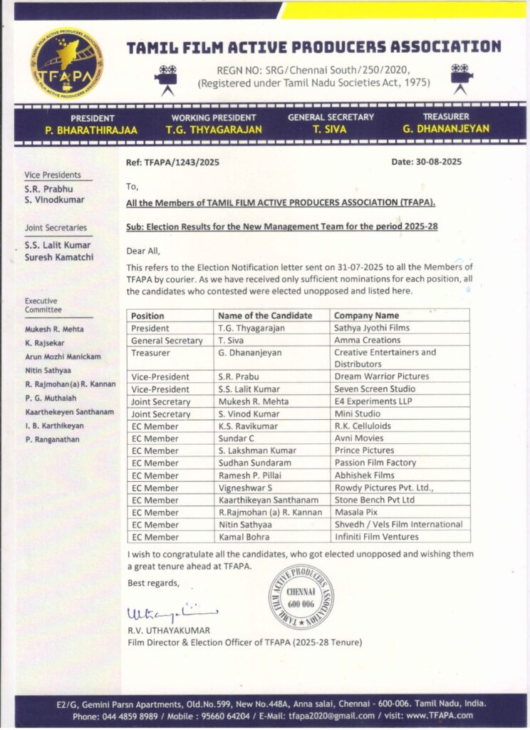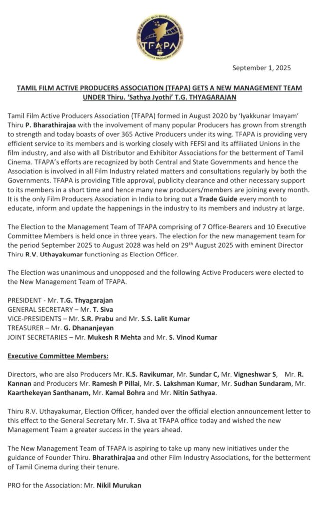 The Election to the Management Team of TFAPA comprising of 7 Office-Bearers and 10 Executive Committee Members is held once in three years. The election for the new management team for the period September 2025 to August 2028 was held on 29th August 2025 with eminent Director Thiru R.V. Uthayakumar functioning as Election Officer.