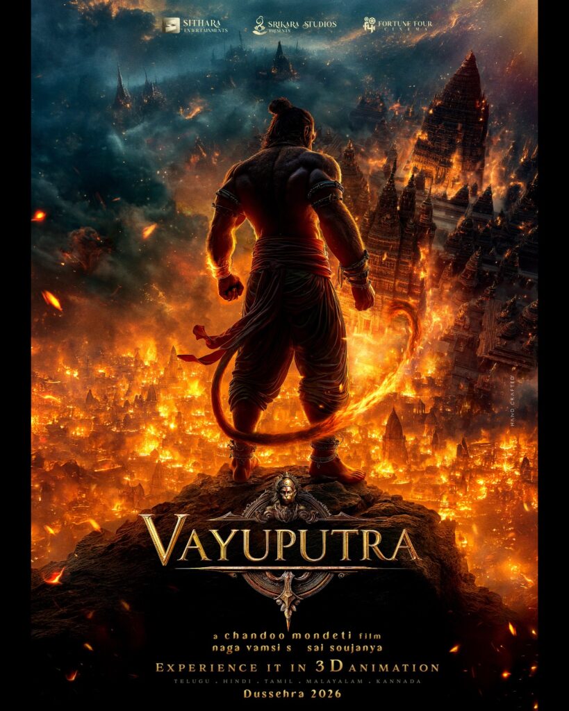 Directed by Chandoo Mondeti and produced by Suryadevara Naga Vamsi and Sai Soujanya under Sithara Entertainments and Fortune Four Cinemas, Presented by Srikara Studios, the film promises a breathtaking fusion of history, devotion and modern spectacle. The grand 3D Animation cinematic experience, Vayuputra is set to bring the timeless tale of Lord Hanuman to theatres worldwide this Dussehra 2026 in Telugu, Hindi, Tamil, Malayalam and Kannada.