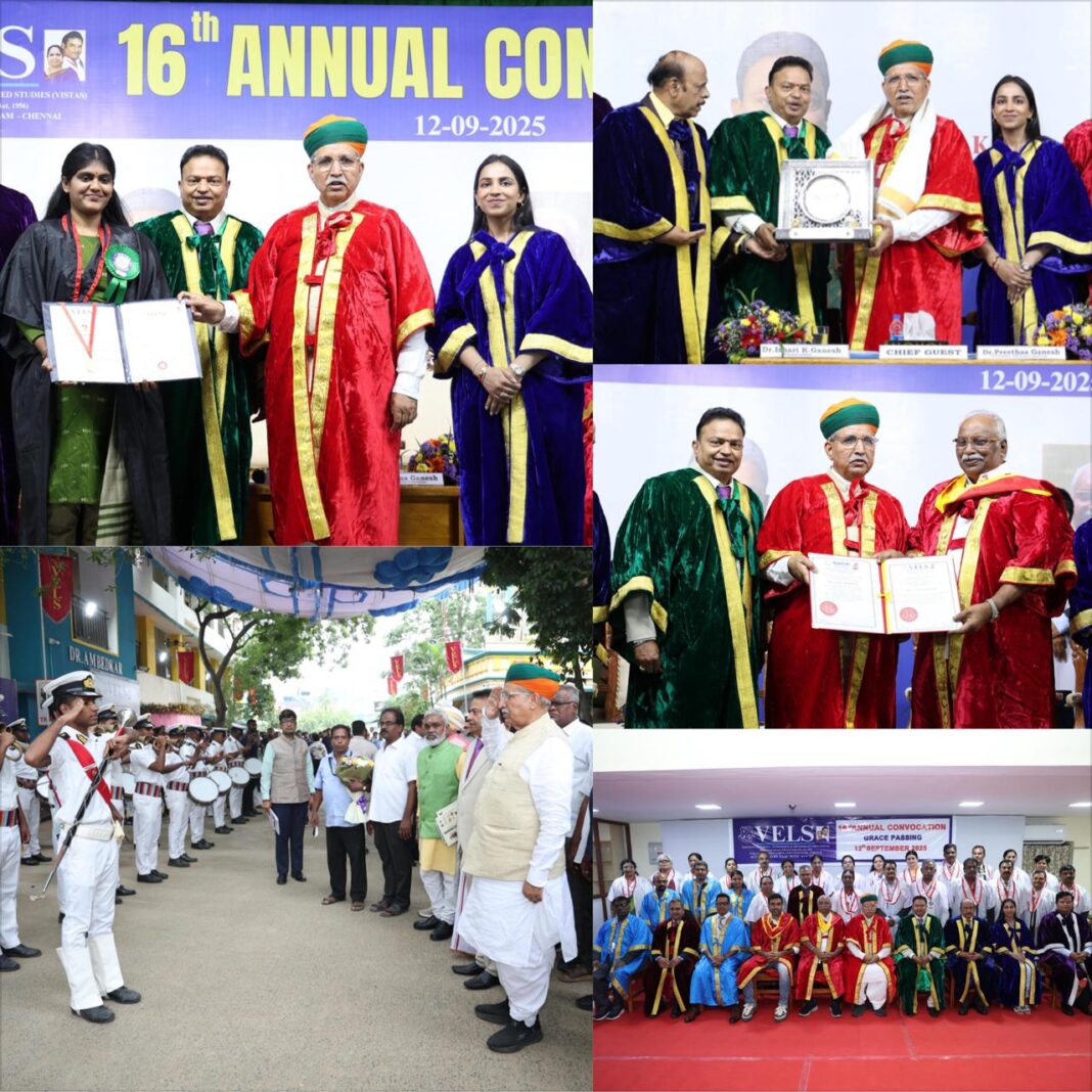Vels Institute of Science, Technology and Advanced Studies (VISTAS) hosted its 16th Annual Convocation Ceremony today at the Pallavaram Vels University Campus, Chennai, during which 4,992 graduates were conferred degrees across various disciplines. The graduates included 3,631 Undergraduates, 1,155 Postgraduates, 2 M.Phil scholars, and 204 Ph.D. awardees.