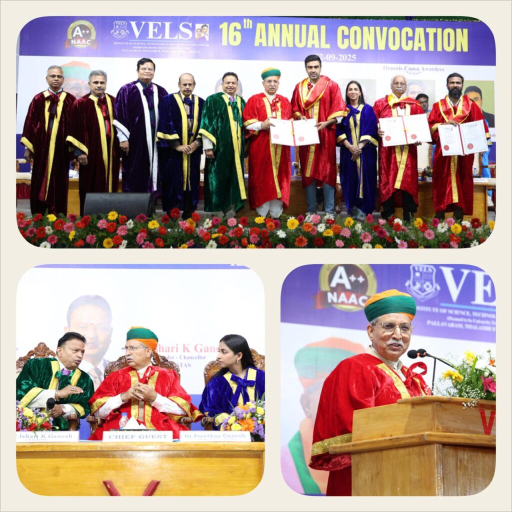 As part of the convocation, Vels University conferred Honorary Doctorate Degrees (Honoris Causa) on three eminent personalities for their exceptional contributions to their respective fields: