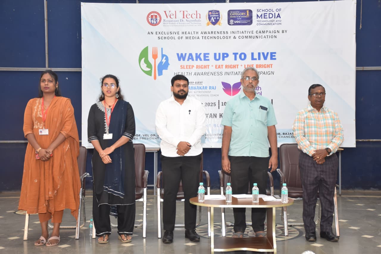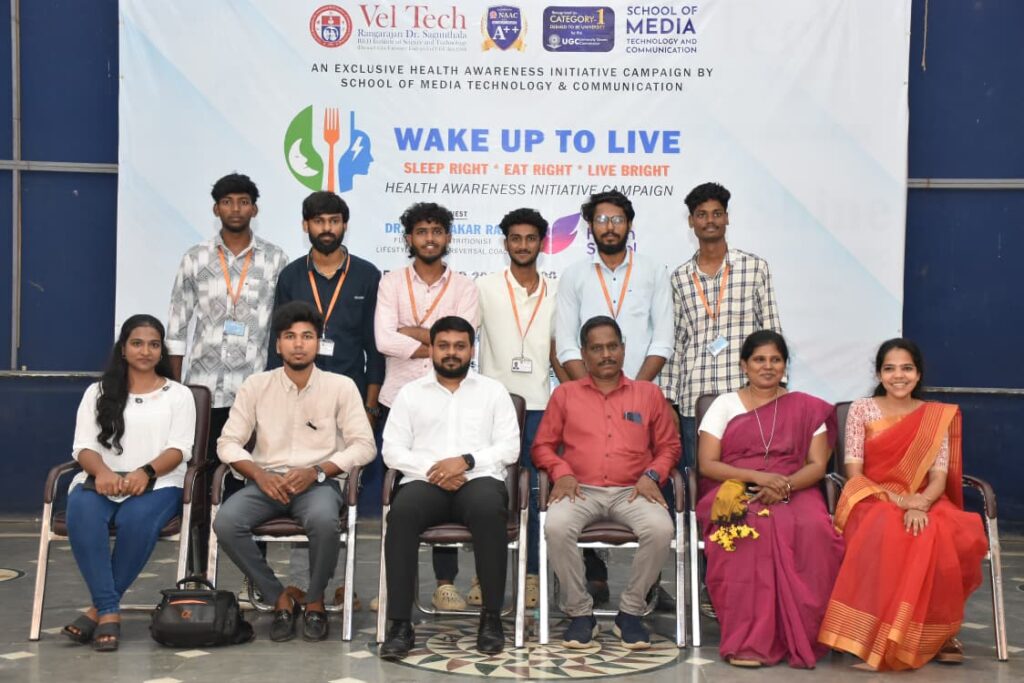 Vel Tech Rangarajan Dr. Sagunthala R&D Institute of Science and Technology, Avadi, Chennai The School of Media Technology and Communication organized a Public Relations Campaign titled “Wake Up to Live – Sleep Right, Eat Right, Live Bright” on 5th November 2025 at the Vel Tech Rangarajan Dr. Sagunthala R&D Institute of Science and Technology, South Campus, Avadi. With the blessings of Col. Prof. Vel Dr. R. Rangarajan (Founder President & Chancellor), Dr. Sagunthala Rangarajan (Foundress President), and Prof. Dr. Raj Gupta (Vice Chancellor), Public Relations Campaign titled “Wake Up to Live – Sleep Right, Eat Right, Live Bright” on 5th November 2025 at the South Campus. The PR Campaign began with Tamil Thaai Vazhthu and was graced by Dr. Prabhakar Raj, Functional Nutritionist and Founder of My Health School, as the Chief Guest. He delivered an inspiring talk on “Healthy Living for a Balanced Mind”, highlighting the importance of good sleep, nutrition, and stress management for overall well-being.