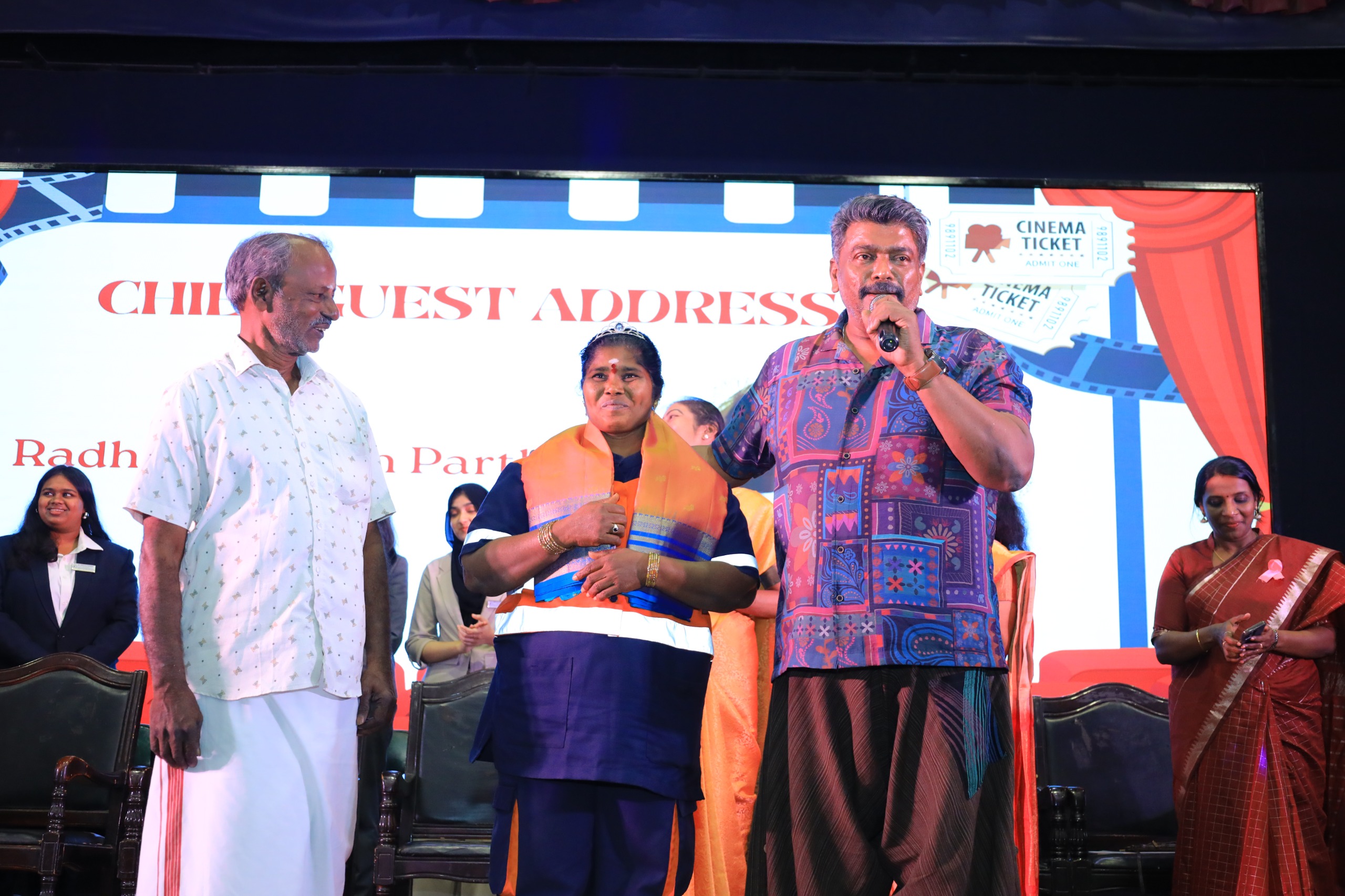 In this context, director and actor Radhakrishnan Parthiban—known as a pioneer of innovations—invited sanitation worker Padma to Ethiraj College for Women and honoured her.