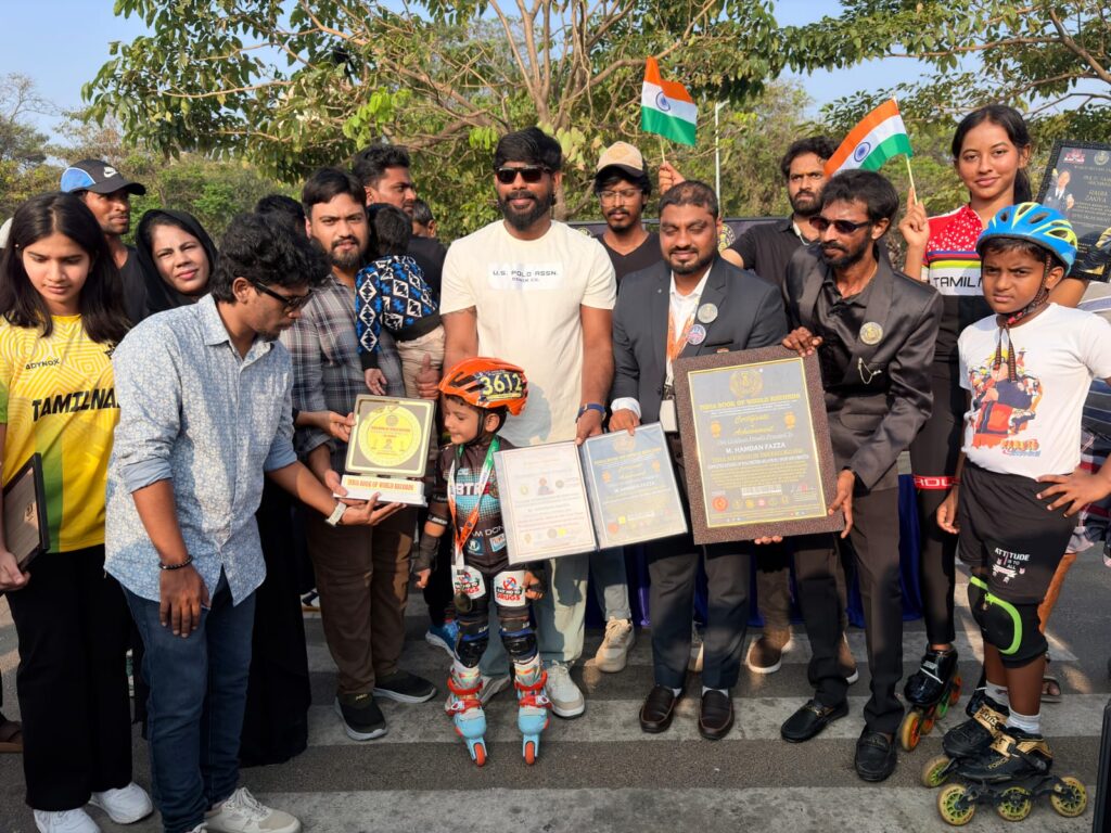 சென்னையைச் சேர்ந்த 4 வயது சிறுவன் எம்.ஹம்தான் ஃபஸா (M.Hamdam Fazza) 8 கி மீ தூரத்தை 1 மணி நேரம் 4 நிமிடங்களில் துளியும் ஓய்வின்றி தொடர்ச்சியாக ஸ்கேட்டிங் மூலம் கடந்து உலக சாதனை நிகழ்த்தியிருக்கிறார்.